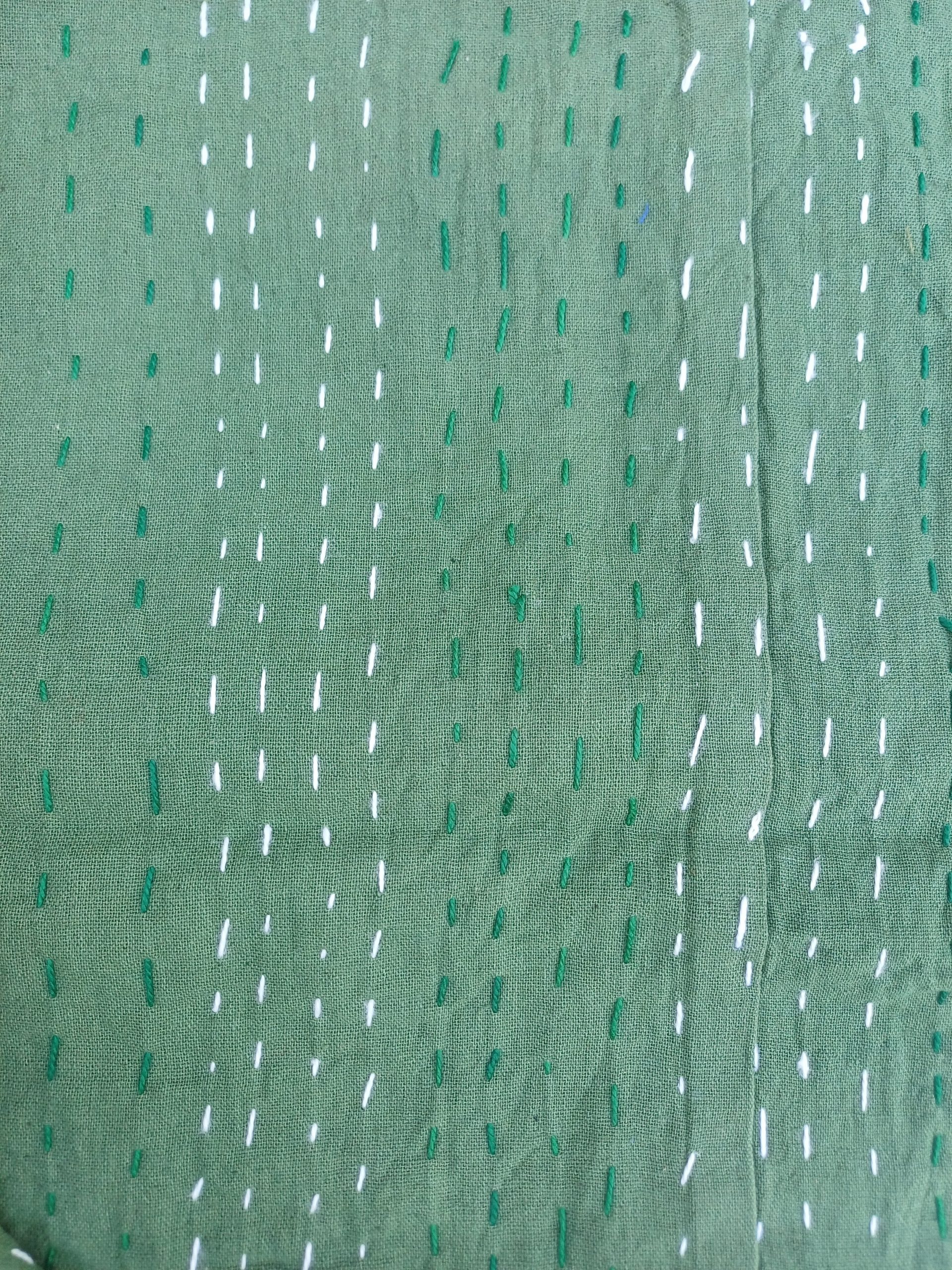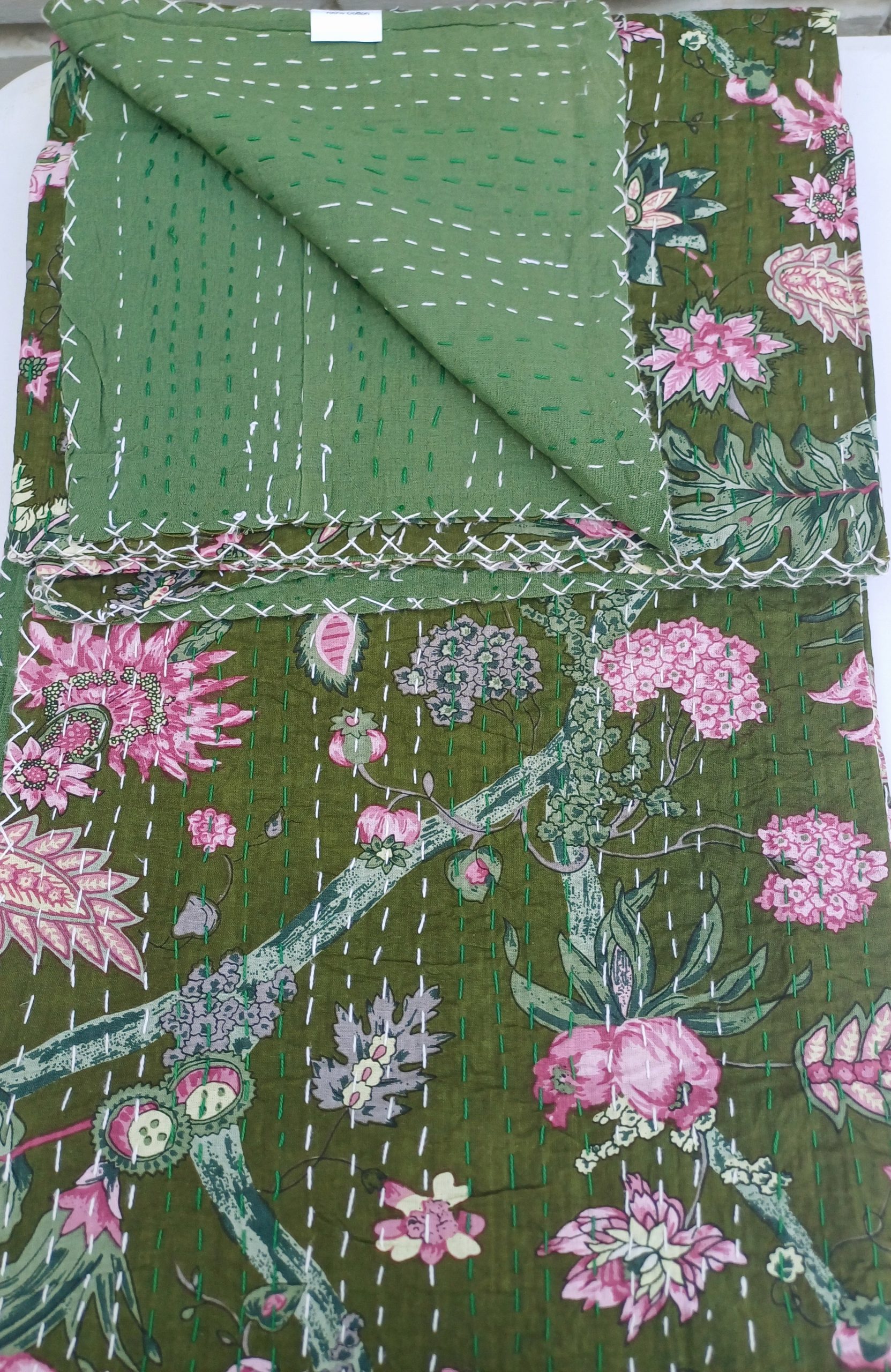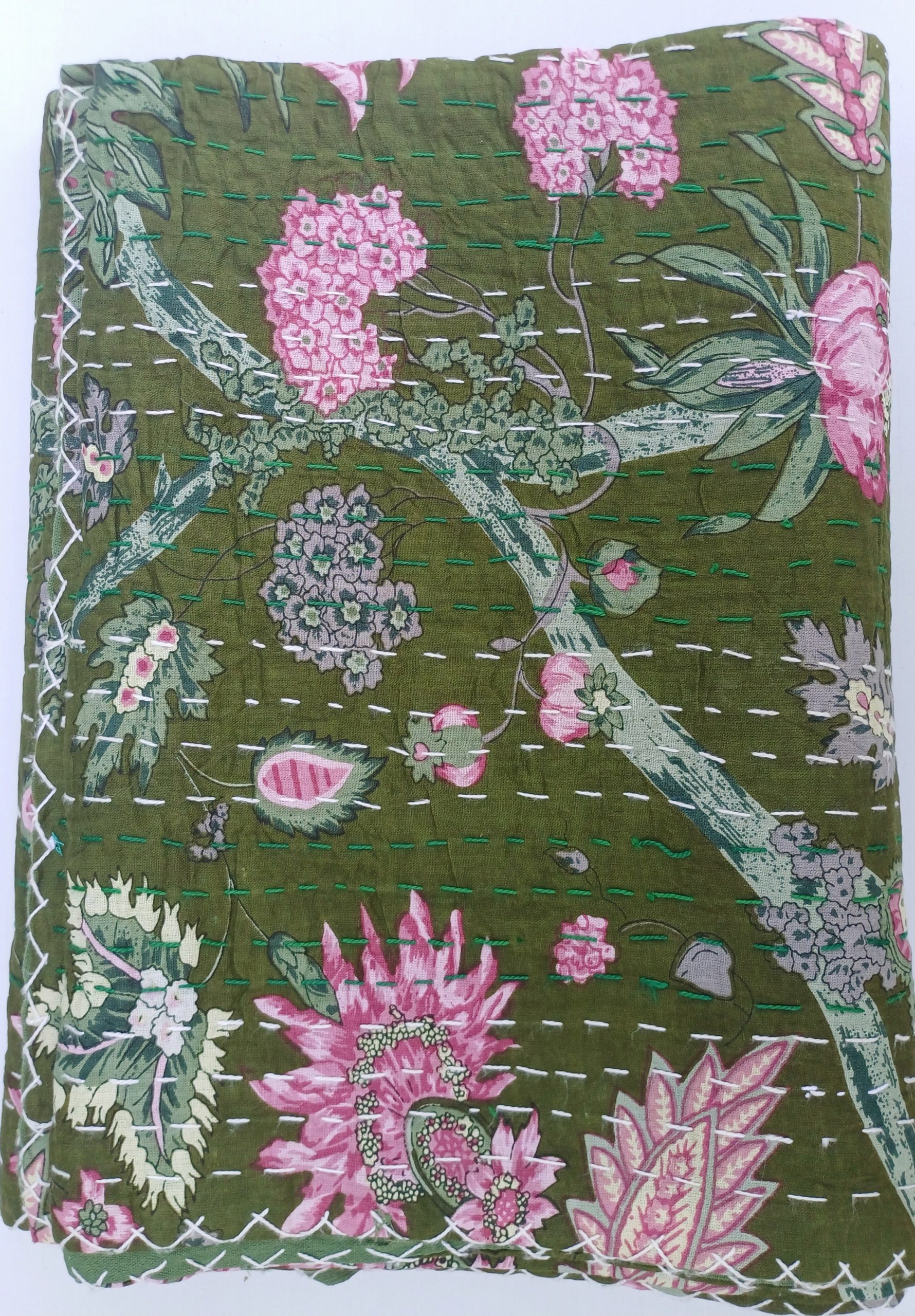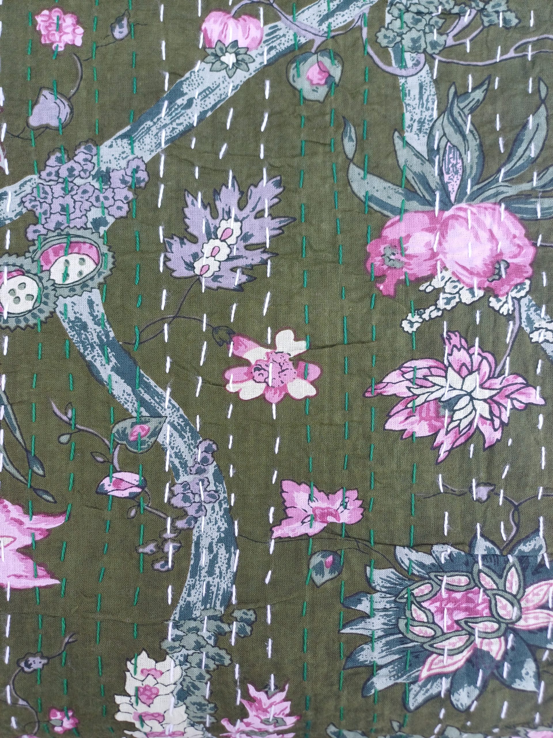 Bedspread Queen (Kantha) Screen Print Gudari (2 layer) – Olive Floral