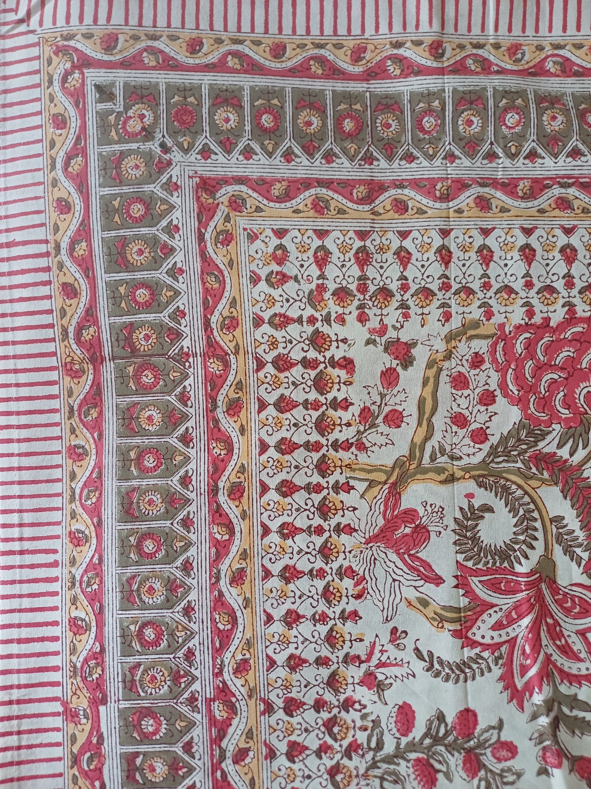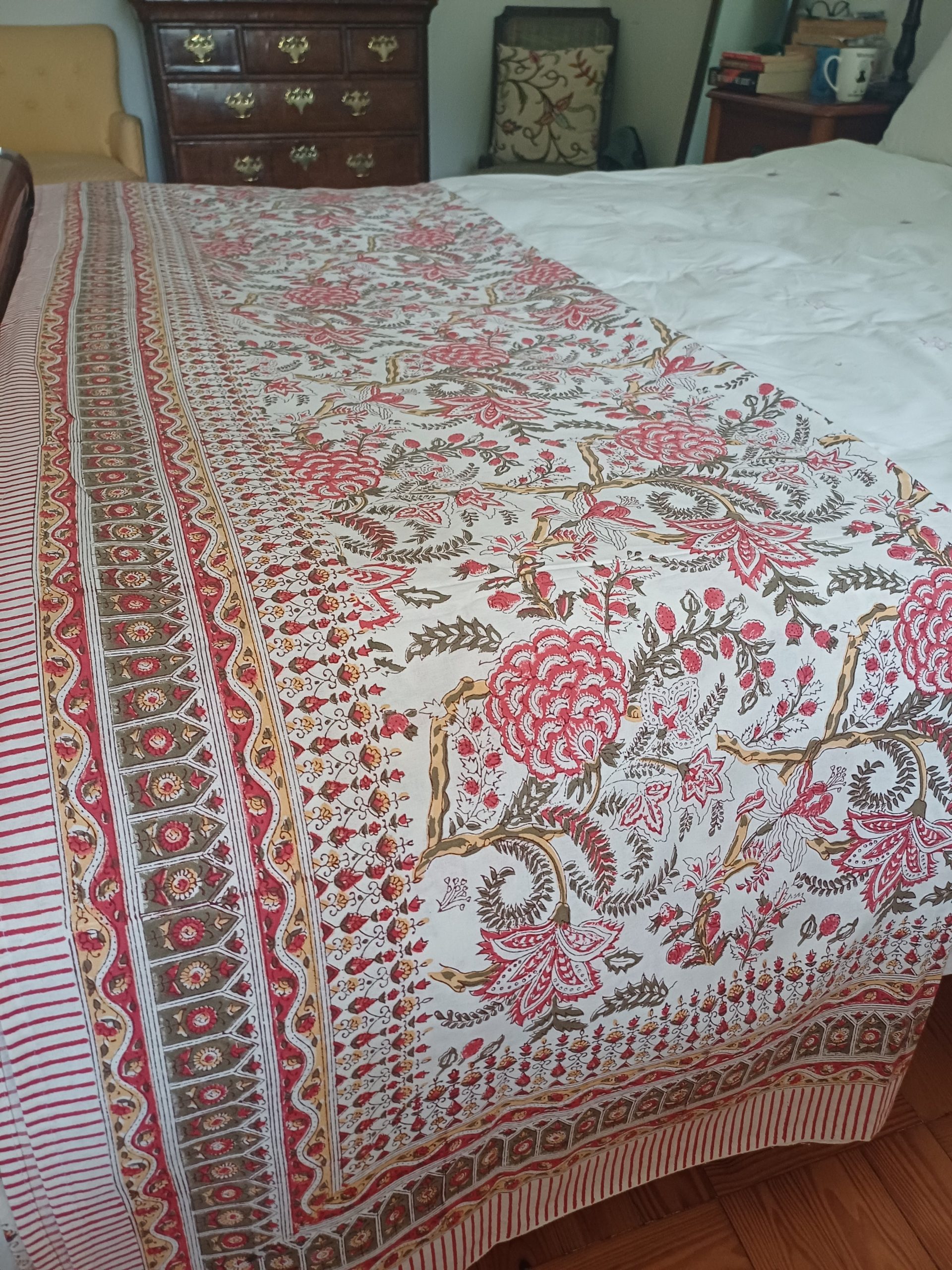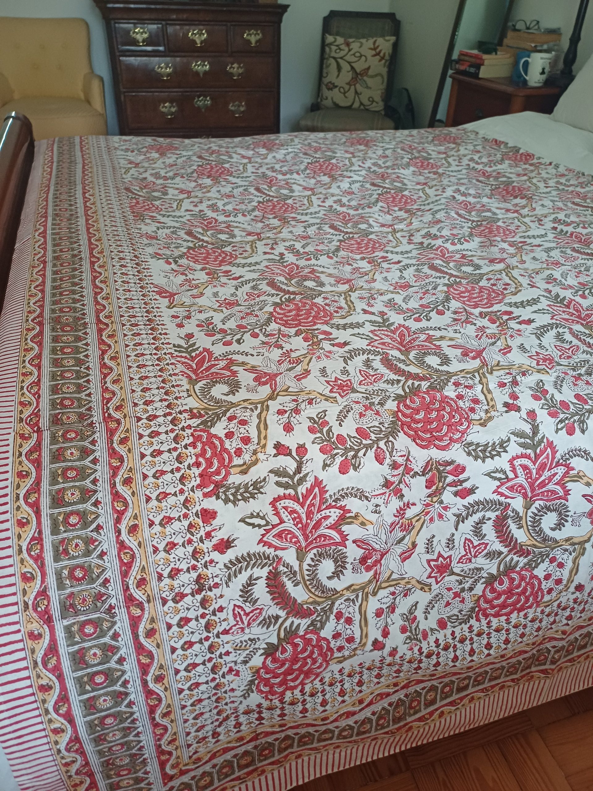 A 100% cotton block print bedspread inspired by Mughal designs from India is a beautiful and intricate piece of traditional craftsmanship.