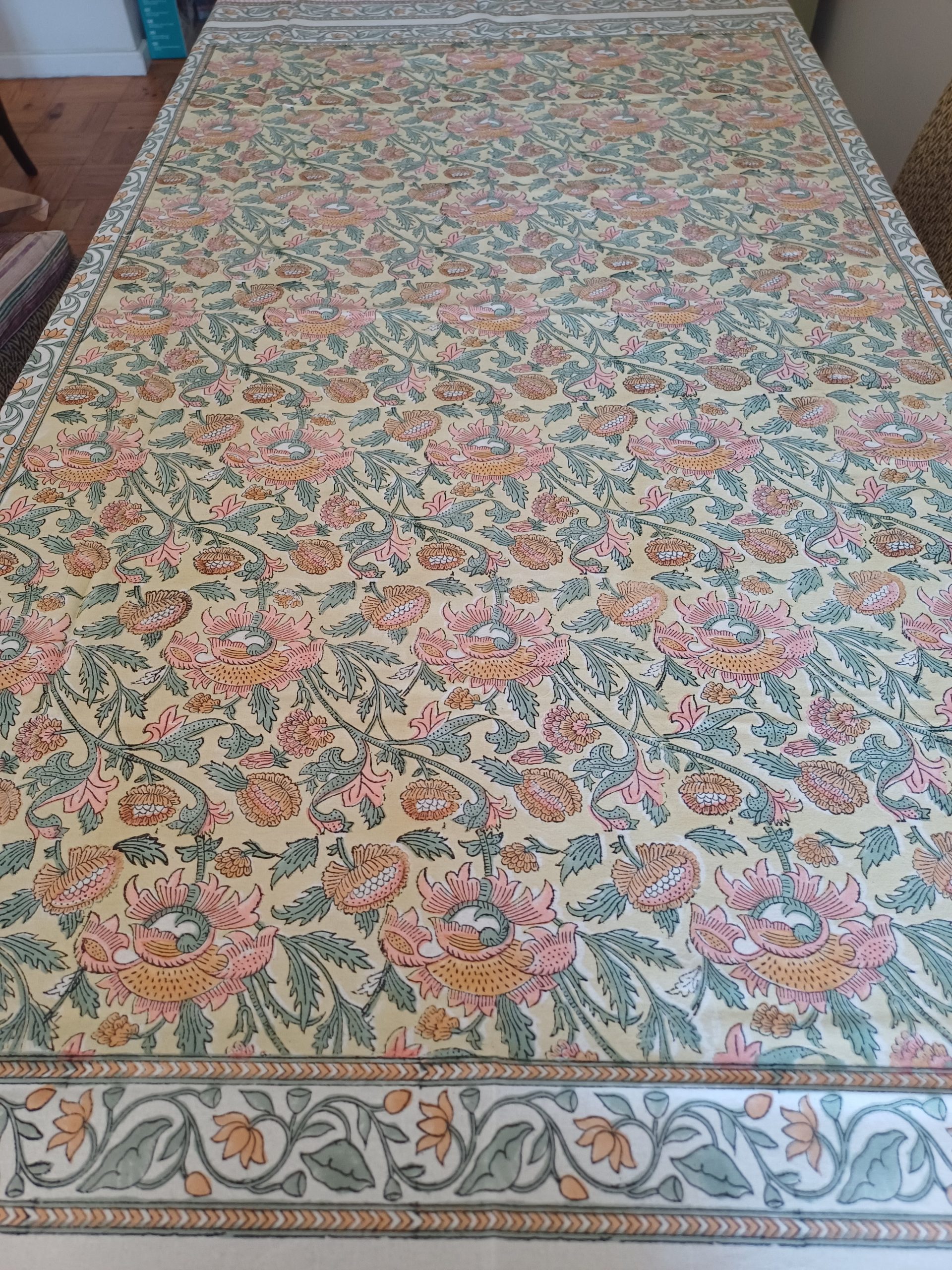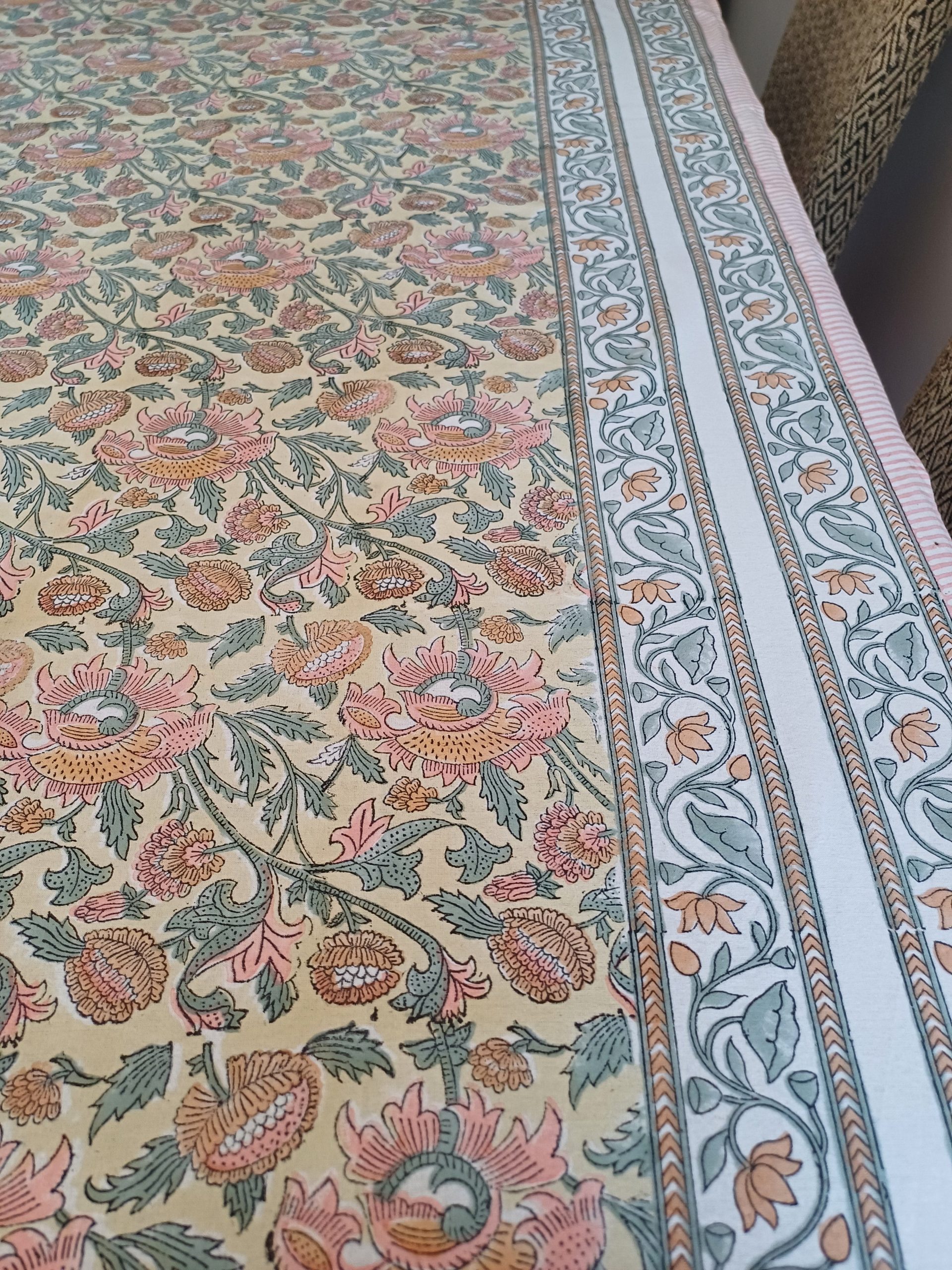 Table Cloth Yellow pink Block Print Mughal – 6 seater – Size: 150cm x 150cm