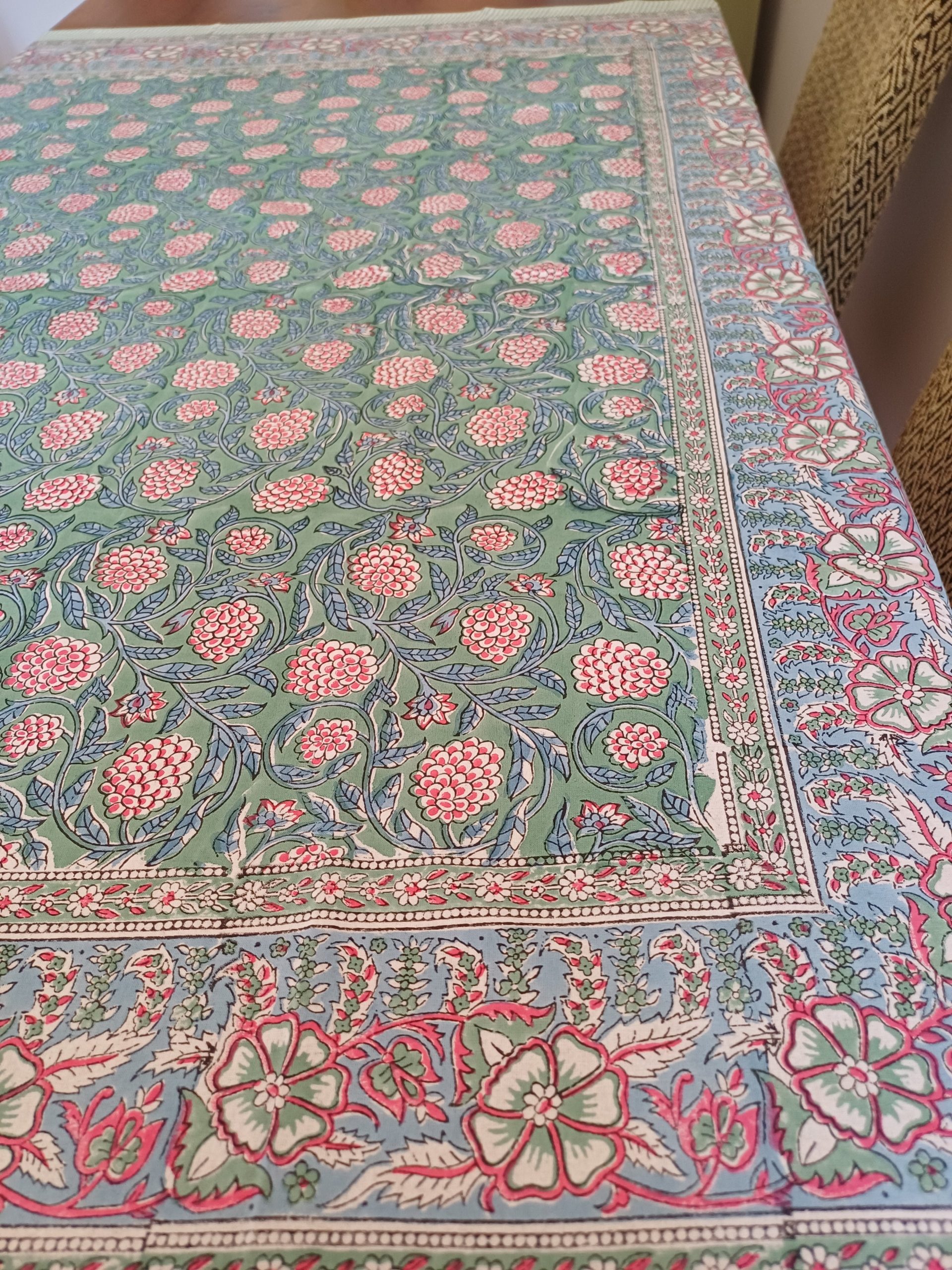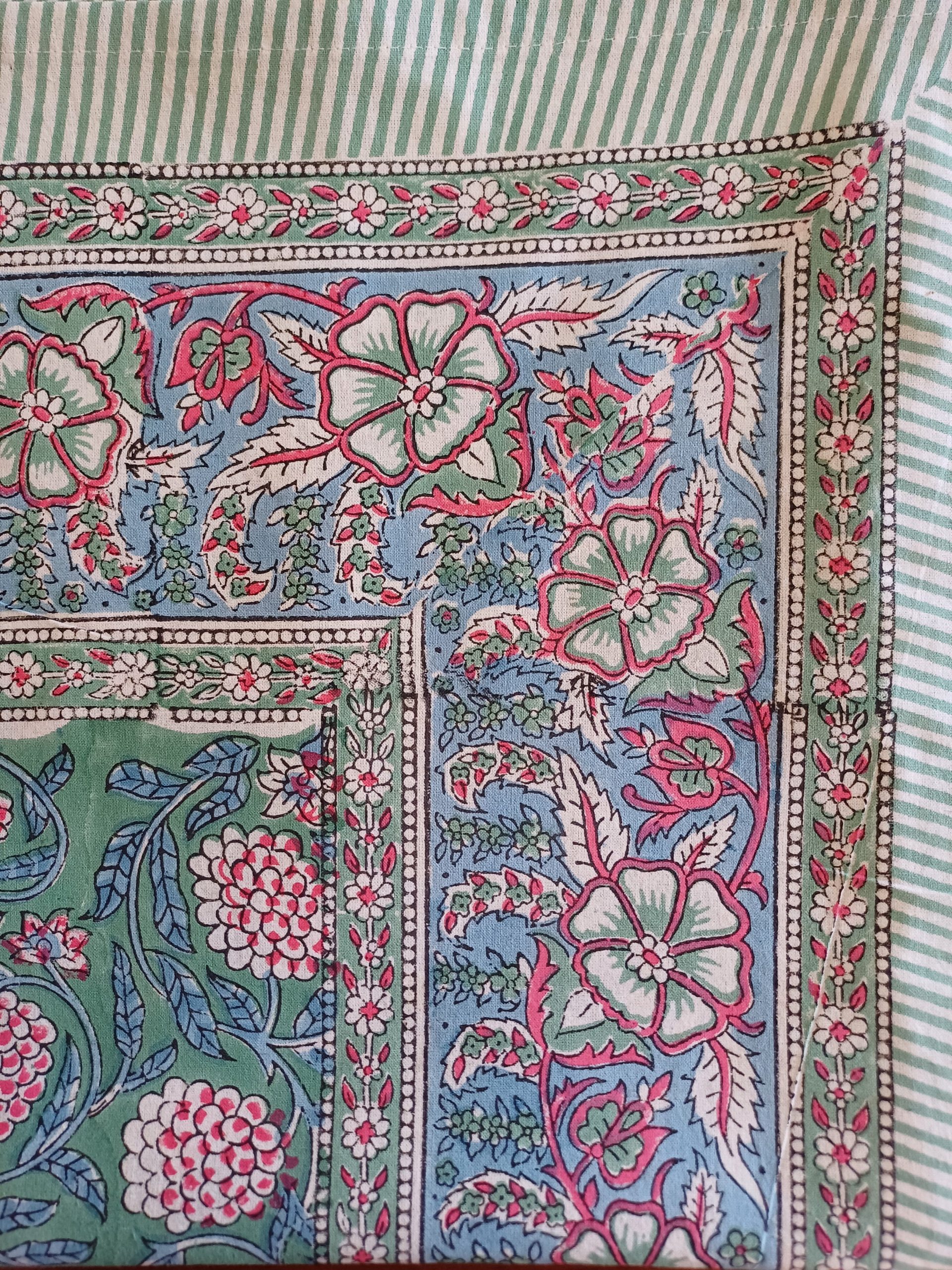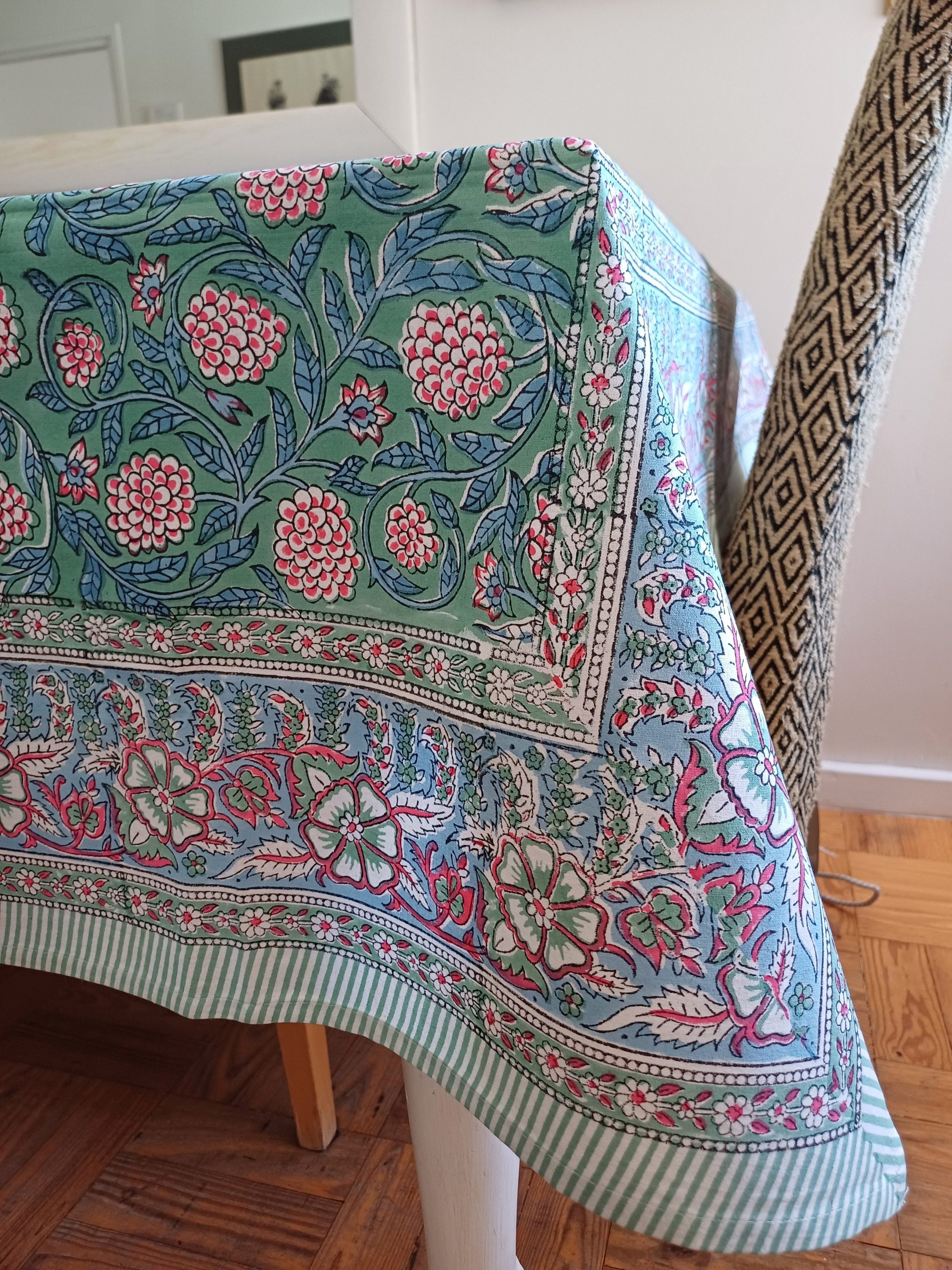 This vibrant 100% cotton table cover features a stunning Indian block-print design inspired by the majestic Mughal Empire. The intricate patterns and motifs, reminiscent of ancient Islamic art, are skilfully rendered in a palette of rich colours. The cover’s beauty is further enhanced by the traditional block-printing technique, which adds a unique texture and character to the fabric.
