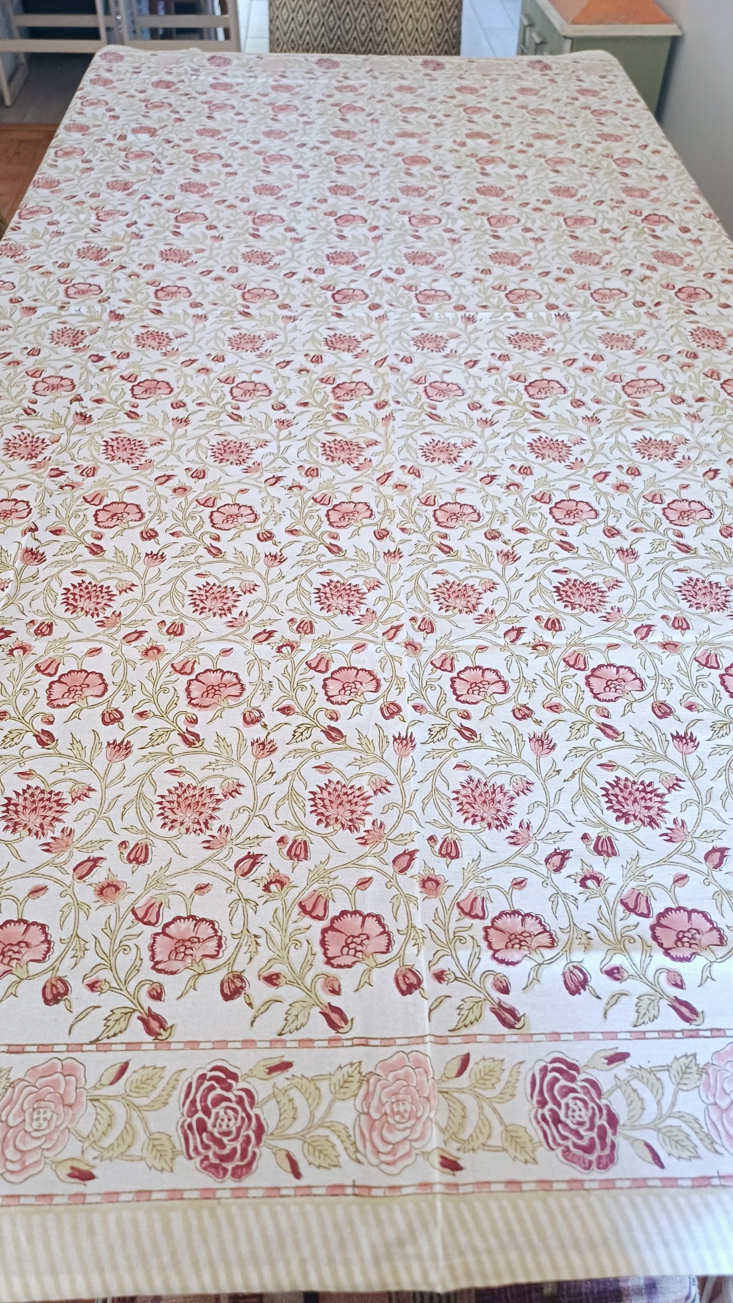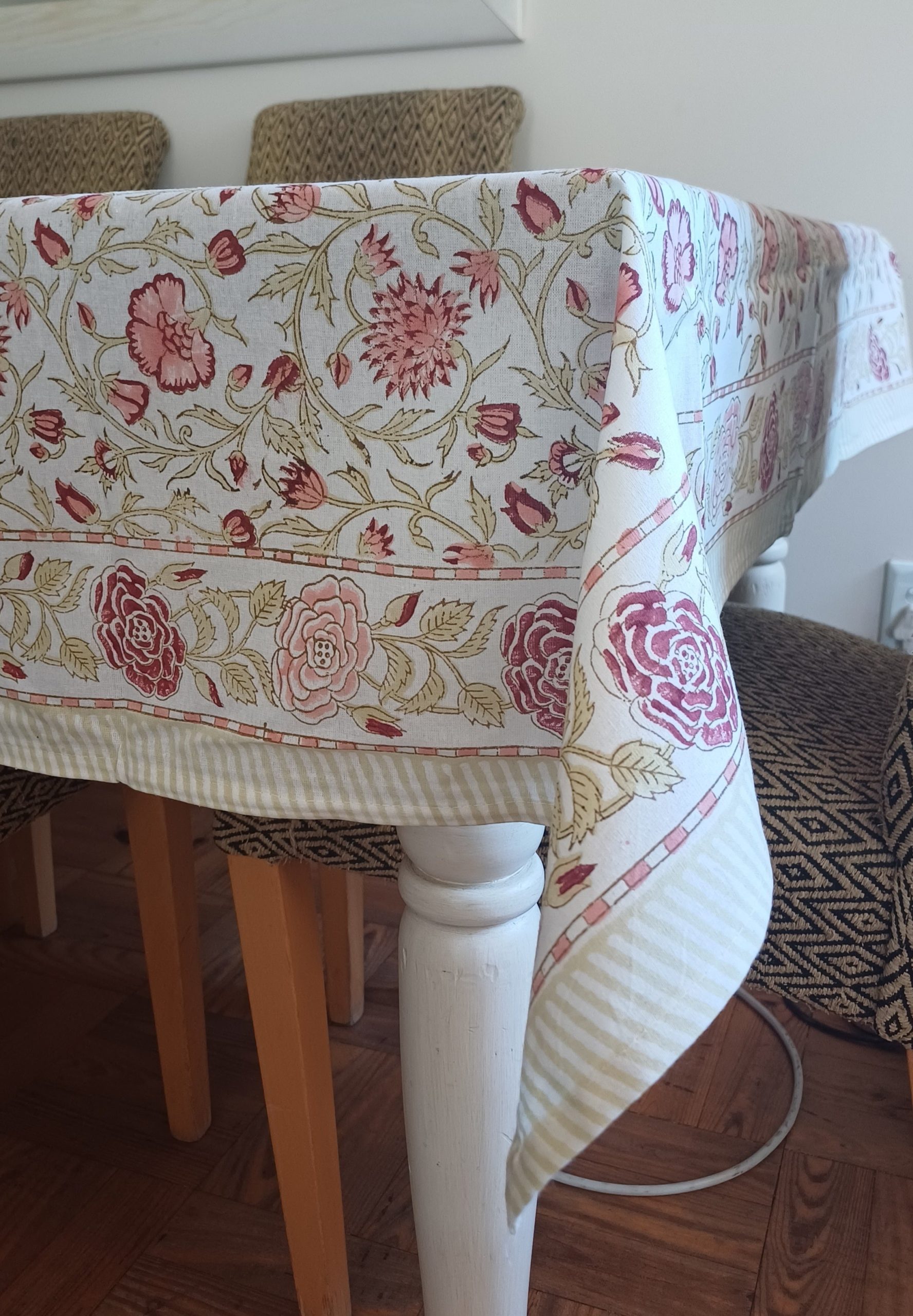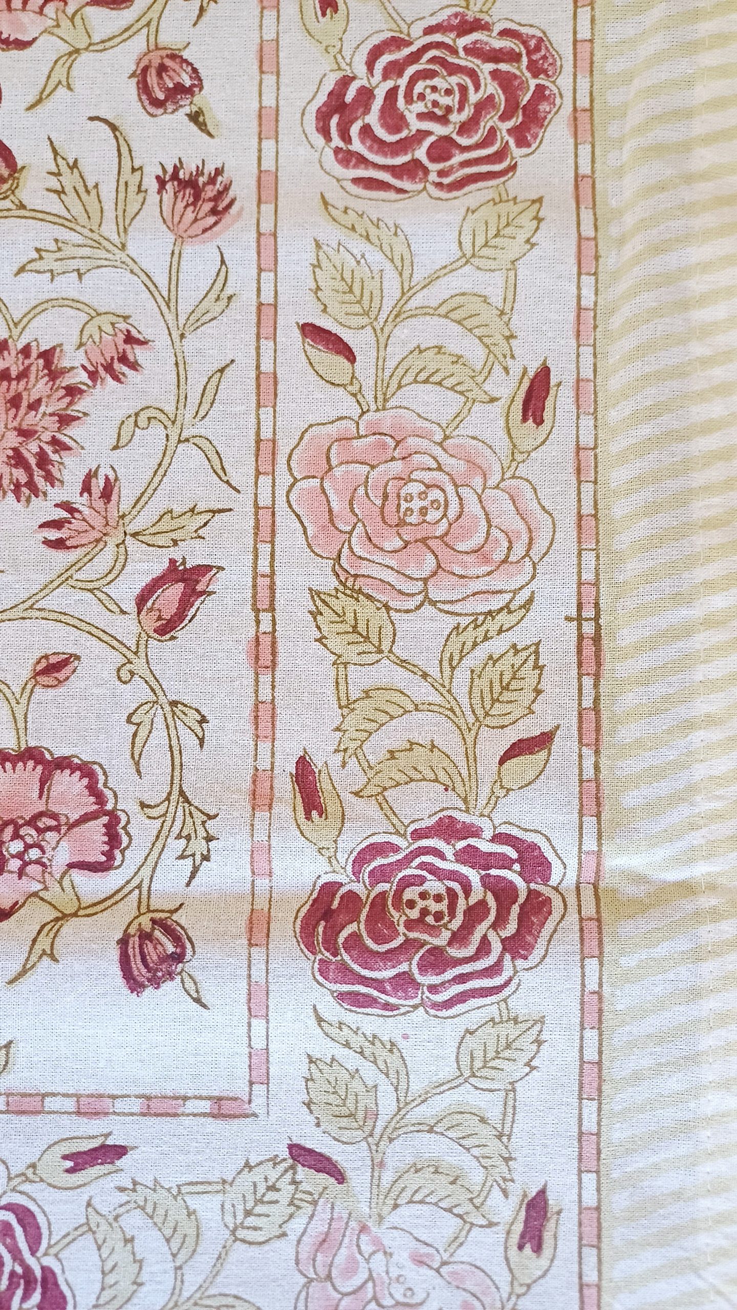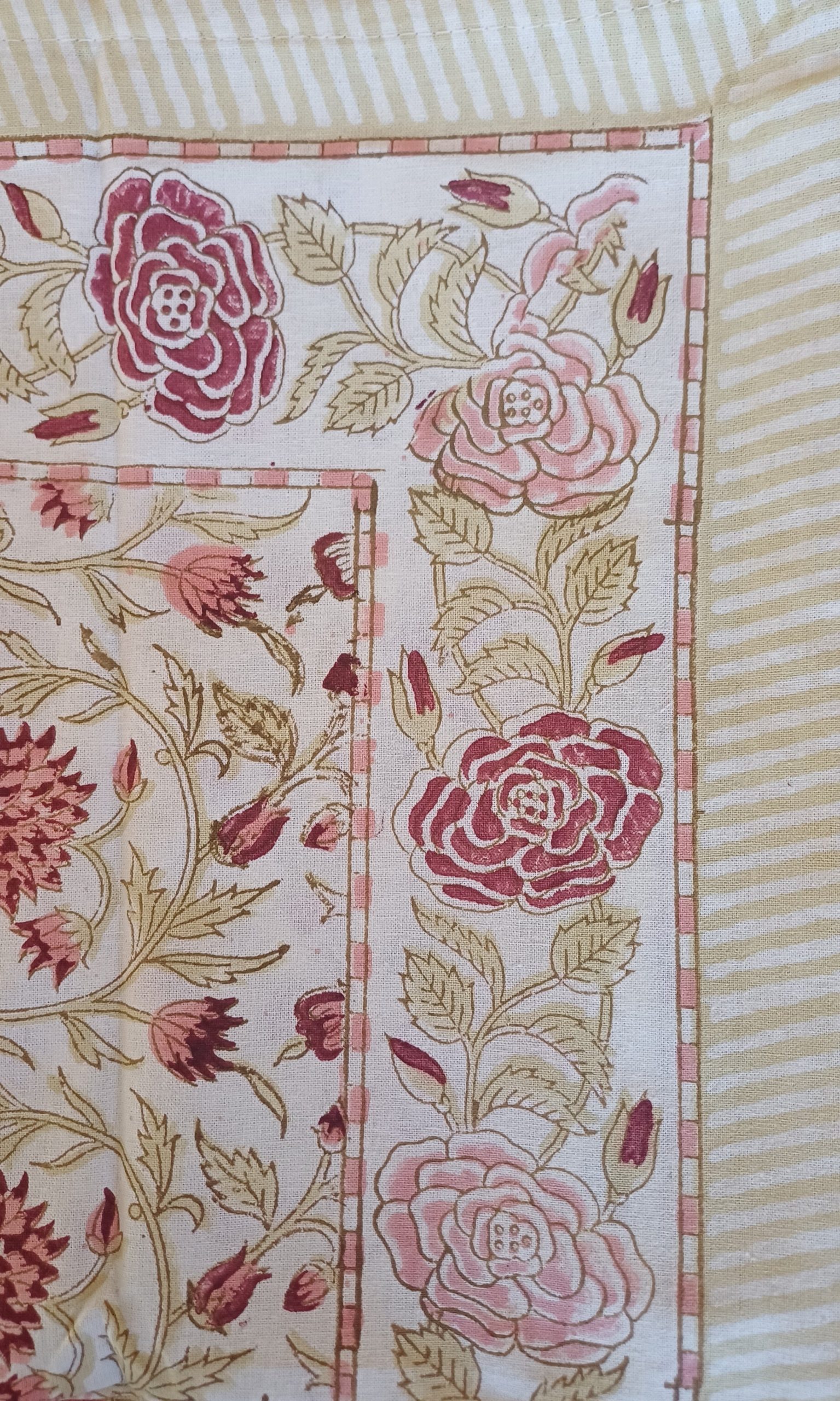 This vibrant 100% cotton table cover features a stunning Indian block-print design inspired by the majestic Mughal Empire. The intricate patterns and motifs, reminiscent of ancient Islamic art, are skilfully rendered in a palette of rich colours. The cover’s beauty is further enhanced by the traditional block-printing technique, which adds a unique texture and character to the fabric.